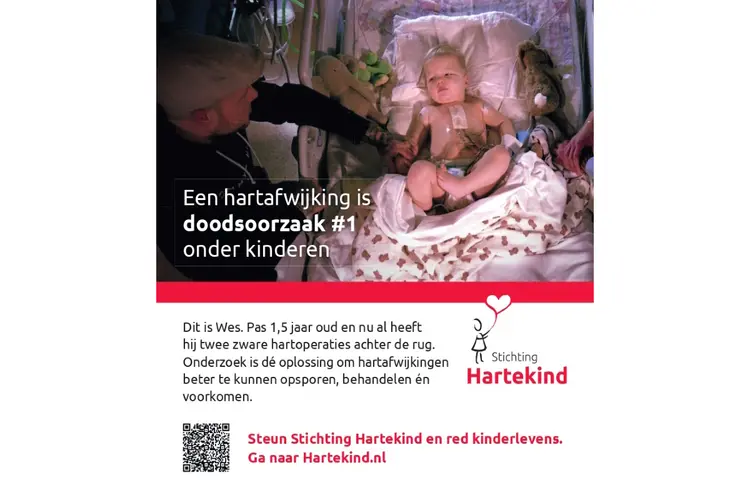 Stichting Hartekind zet zich met hart en ziel in om de overlevingskansen van kinderen met een hartafwijking te vergroten en hun kwaliteit van leven te verbeteren. Maar liefst 1 op de 100 baby's wordt geboren met een hartafwijking en de impact op een kind en een gezin is enorm. Ongeveer tweederde van deze hartekinderen moet vlak na de geboorte al een ingrijpende, levensreddende operatie ondergaan. Soms zelfs meer dan één keer. De meeste hartekinderen krijgen vervolgens hun leven lang te maken met obstakels. Bovendien hebben zij vaak een kortere levensverwachting en beperkingen door hartfalen, hartritmestoornissen en/of opgelopen hersenschade. Ongeveer iedere 48 uur overlijdt er in Nederland een hartekind. Dat maakt een hartafwijking doodsoorzaak nummer 1 onder kinderen. Stichting Hartekind financiert levensbelangrijk onderzoek en geeft voorlichting aan ouders. Zo komt een wereld waarin ook hartekinderen onbezorgd kind kunnen zijn, steeds dichterbij. www.hartekind.nl