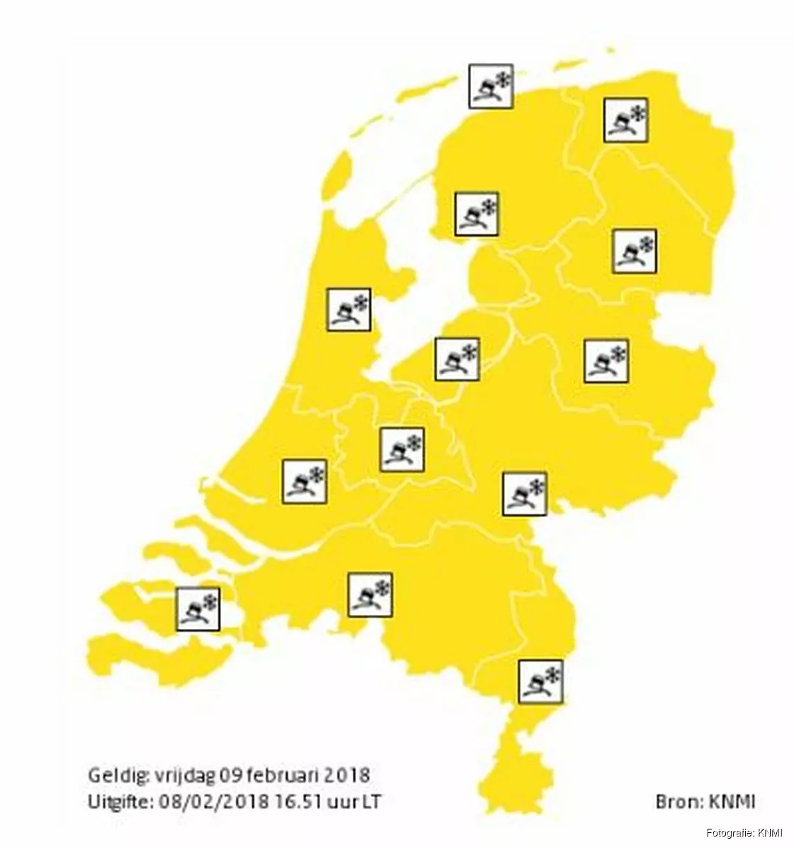 In de loop van de middag gaat de sneeuw in het westen weer over in regen of natte sneeuw. In totaal kan in het westen en midden 1-3 cm sneeuw vallen, in het oosten en noordoosten 0-2 cm.