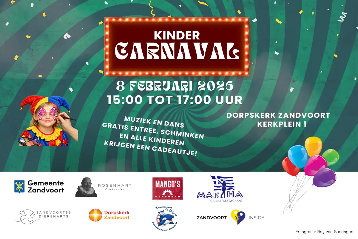 Het kindercarnaval vindt plaats in de Dorpskerk aan het Poststraat 1 in Zandvoort en is toegankelijk voor alle kinderen van 15.00 tot 17.00 uur. Na afloop ontvangen alle kinderen een leuk cadeautje.