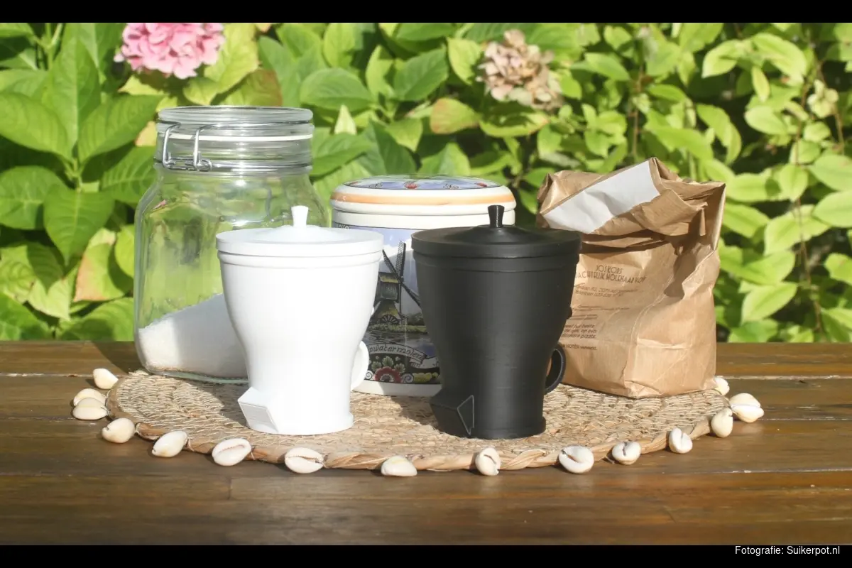 "Bij veel mensen roept de suikerpot herinneringen op aan vroeger – aan grootouders en zondagse koffie," vertelt Albert van Kouwen. "Toen ik ontdekte dat ze nergens meer te krijgen waren, besloot ik ze opnieuw te maken. Eerst in kunststof, in veel vrolijke kleuren en verschillende prints. De opbrengst gebruik ik om de metalen uitvoeringen opnieuw te produceren – precies zoals mensen zich ze herinneren."